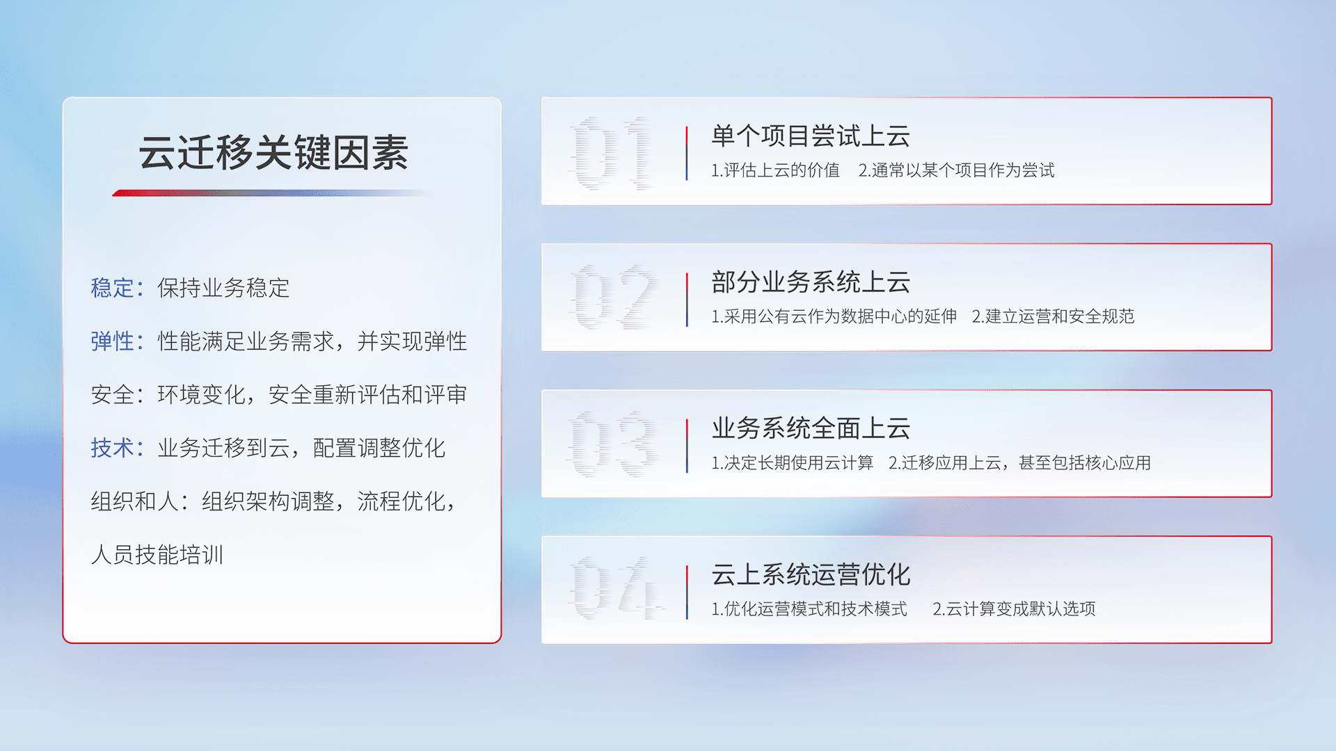 结合实际业务,,,从规划设计、、、、云平台选型、、、云原生改造、、、、数据迁移、、、、集成交付,,,,迁移全过程为客户识别最佳上云路径,,,做好风险识别管理,,,设计网络架构、、身份权限、、安全审计合规、、、、操作审计、、日志审计、、、、监控告警策略、、多站点容灾设计等,,对云上基础设施进行整体规划,,提升IT治理水平,,,以满足弹性、、、、高可用、、高性能的需求。。。