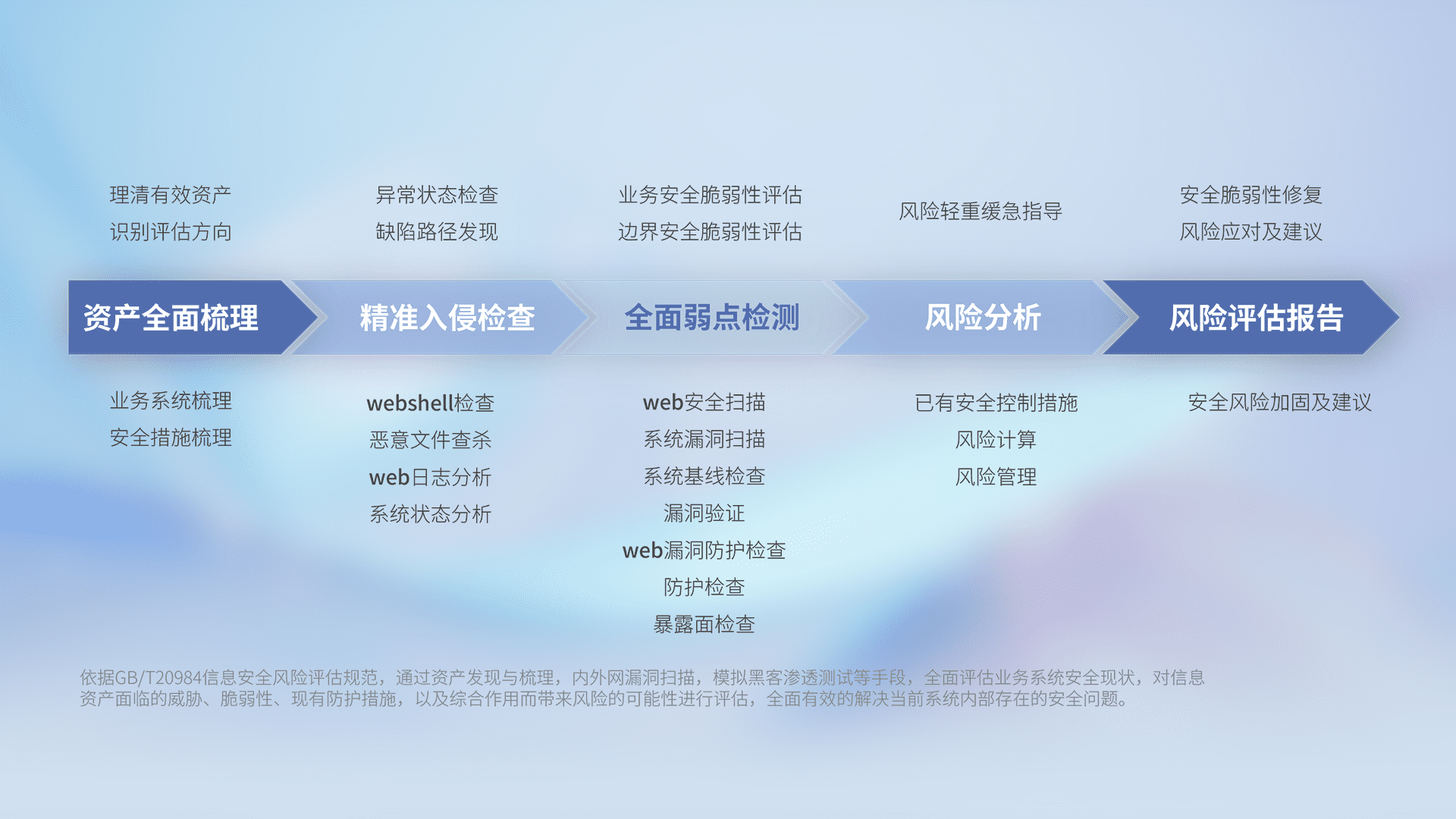 针对客户行业特性,,,,以专业的安全服务+多厂商联合解决方案提供专属的一站式安全管理服务,,帮助客户全面感知网络空间威胁,,,,基于识别、、、检测、、、分析、、、、防护、、、、监测、、响应的服务理论模型,,,从方案咨询、、集成交付、、、评估验证、、、、优化加固、、、、运维运营,,,,致力于为客户提供完整的闭环管理式安全服务。。。以实战经验为客户打造高抵御风险的安全体系,,,,帮助客户发现威胁、、对抗威胁、、、处置威胁,,不断积累安全对抗能力,,,持续保障数字化安全。。
